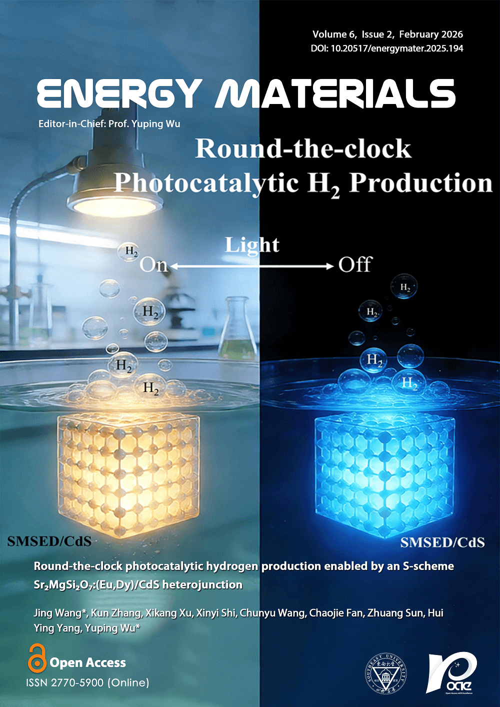 view this paper Back Cover Picture: Round-the-clock photocatalytic hydrogen production is essential for overcoming the intermittency of solar energy and achieving continuous solar-to-hydrogen conversion. However, the development of efficient round-the-clock photocatalysts remains a considerable challenge due to limited light availability and inefficient charge utilization in the dark. In this work, a long-afterglow-based S-scheme heterojunction photocatalyst, Sr2MgSi2O7:(Eu,Dy)/CdS (referred to as SMSED/CdS), is constructed via a ball-milling strategy. The luminescence from Sr2MgSi2O7:(Eu,Dy) (referred to as SMSED) is efficiently captured by CdS, thus serving as a built-in light source to drive dark catalytic reactions. Meanwhile, the unique electron transfer pathway in SMSED provides sufficiently long-lived electrons for the SMSED/CdS system. The S-scheme heterojunction formed between SMSED and CdS directs the photogenerated charge transfer, while maintaining the strong redox capability of SMSED/CdS. Consequently, the SMSED/CdS exhibits hydrogen production of 45.20 mmol g-1 under ultraviolet-visible light within 1 h and a dark activity of 4.37 mmol g-1 sustained over 3 h. The corresponding mechanism was comprehensively studied via analysis of physicochemical properties, band structure, ex-situ and in-situ X-ray photoelectron spectroscopy, and density functional theory calculations. This study provides a significant breakthrough in developing round-the-clock photocatalysts.